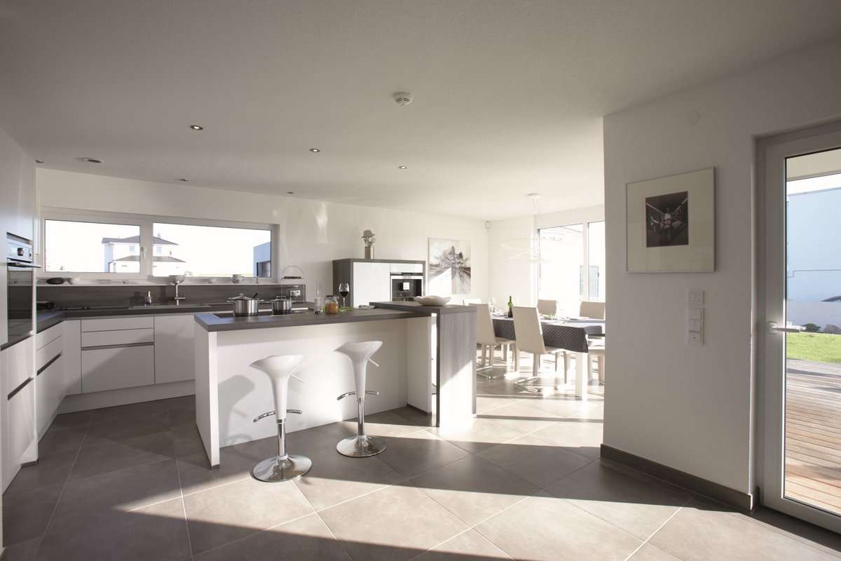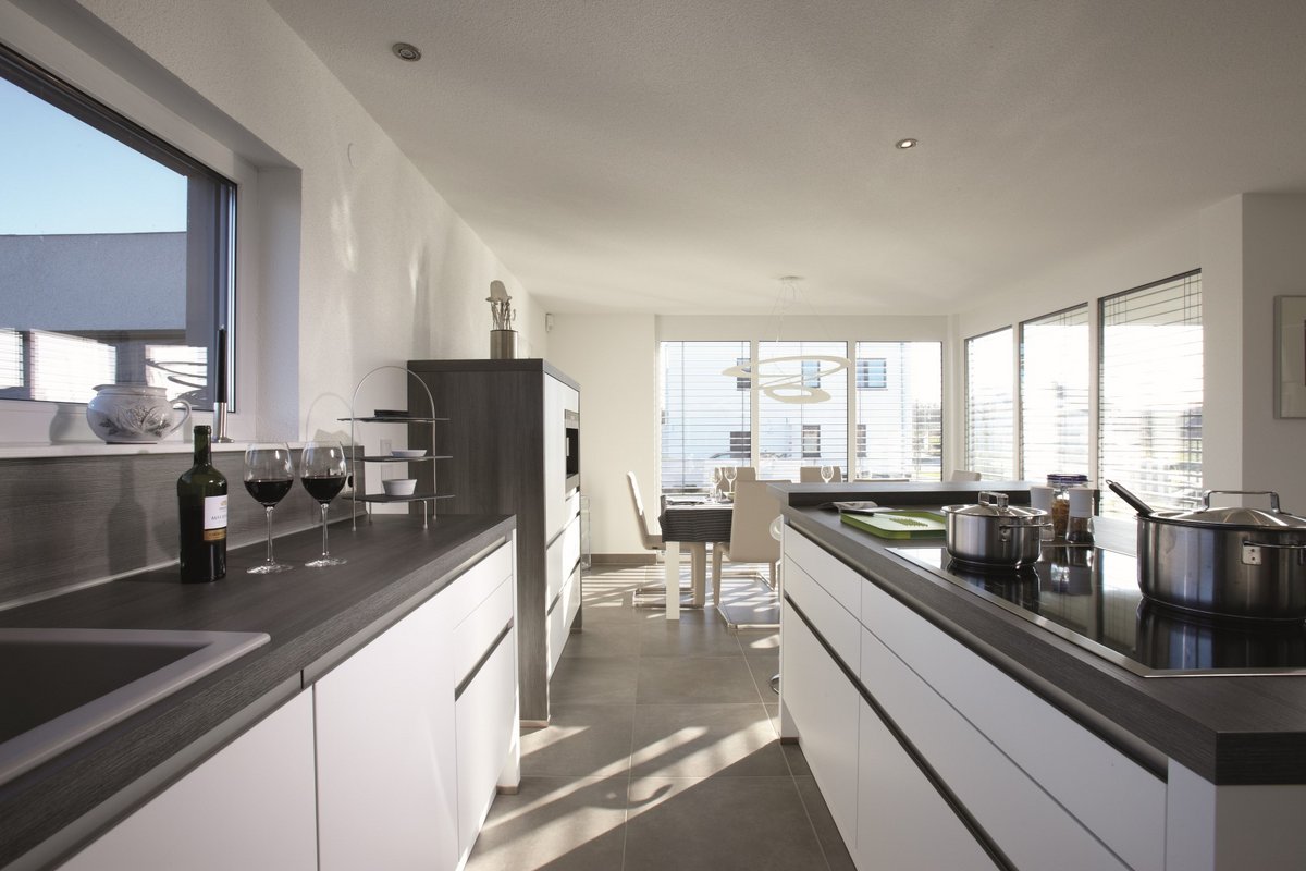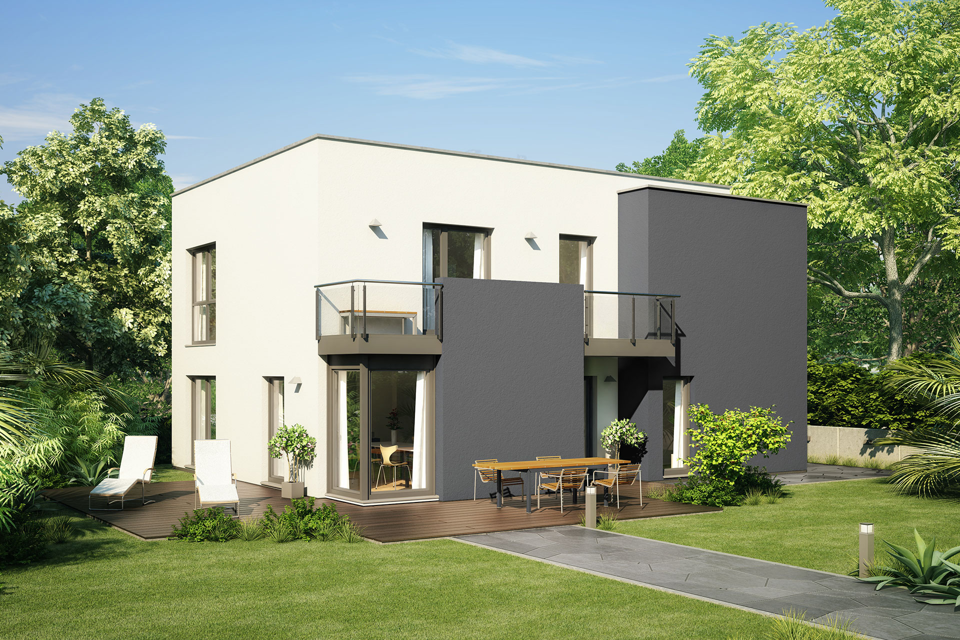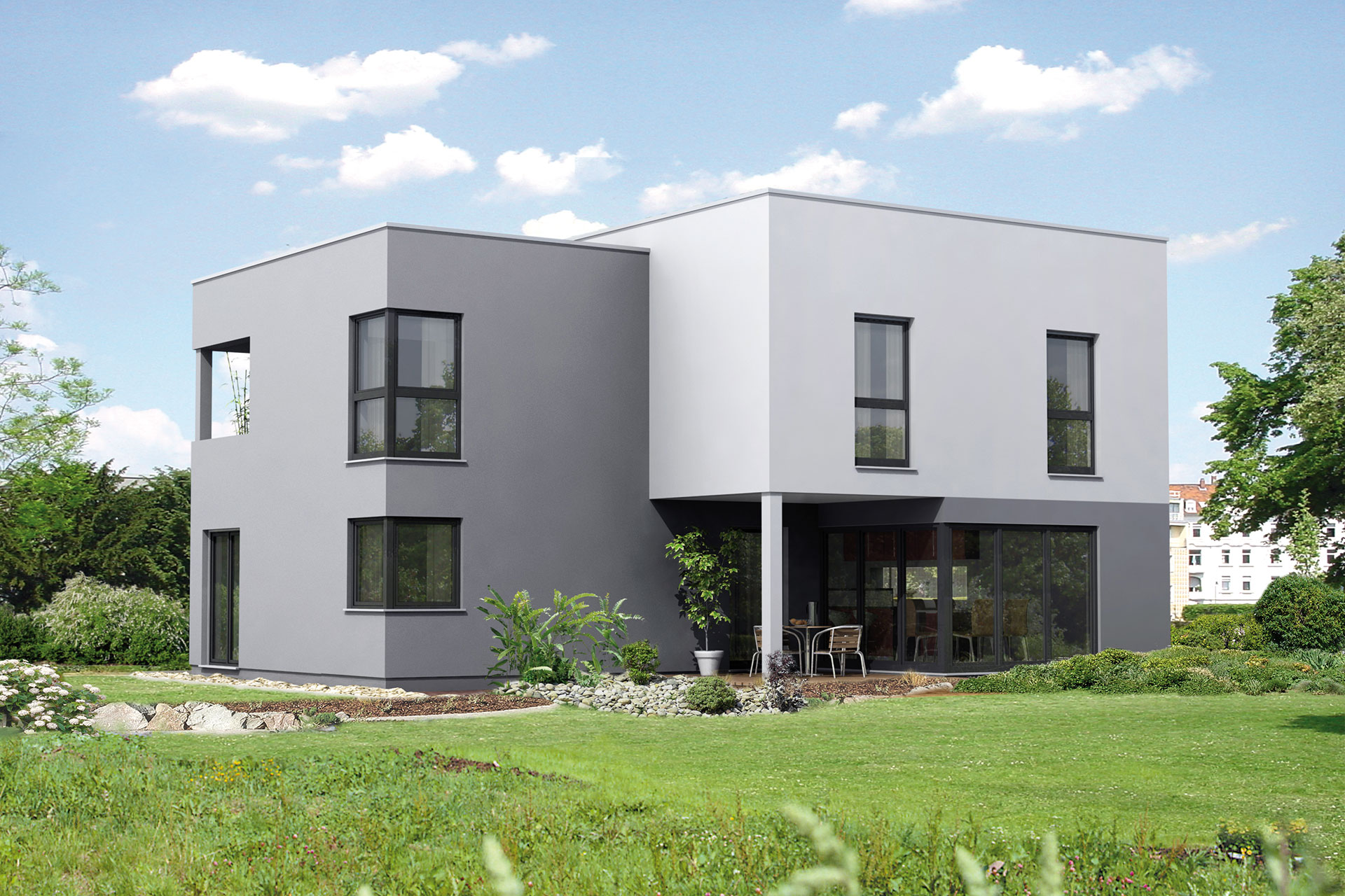 Typisch für dieses Konzept: die geradlinige, kubische Außengestaltung mit Flachdach. Große Glasflächen lockern die strenge Gestaltung bewusst auf und bringen Licht und gute Laune ins Haus.