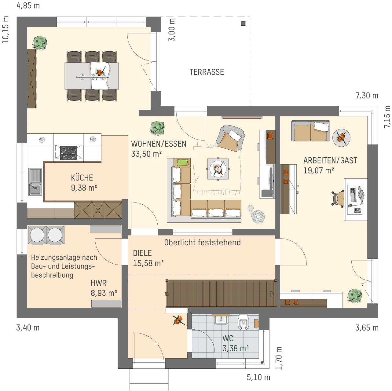 Rund 170 m² Wohnfläche und zwei Grundrissvarianten bilden den Ausgangspunkt für Ihre persönliche Planung. So bekommen Ihre gehobenen Wohnansprüche den richtigen Rahmen - inklusive schöner Loggia im Obergeschoss und überdachter Gartenterrasse. So kann anspruchsvolles, modernes Wohnen heute aussehen!