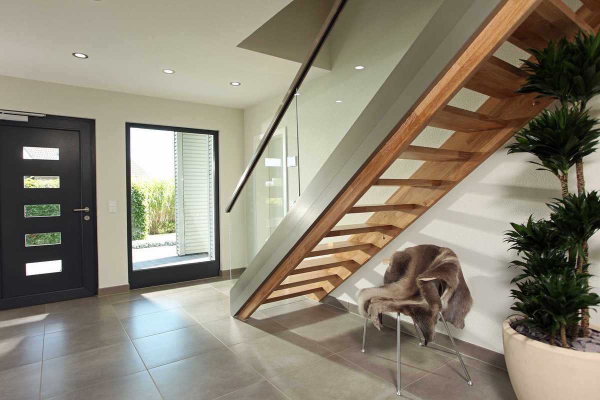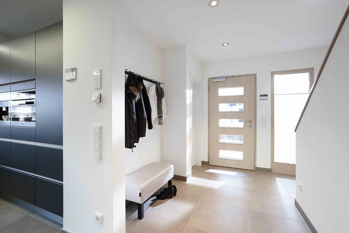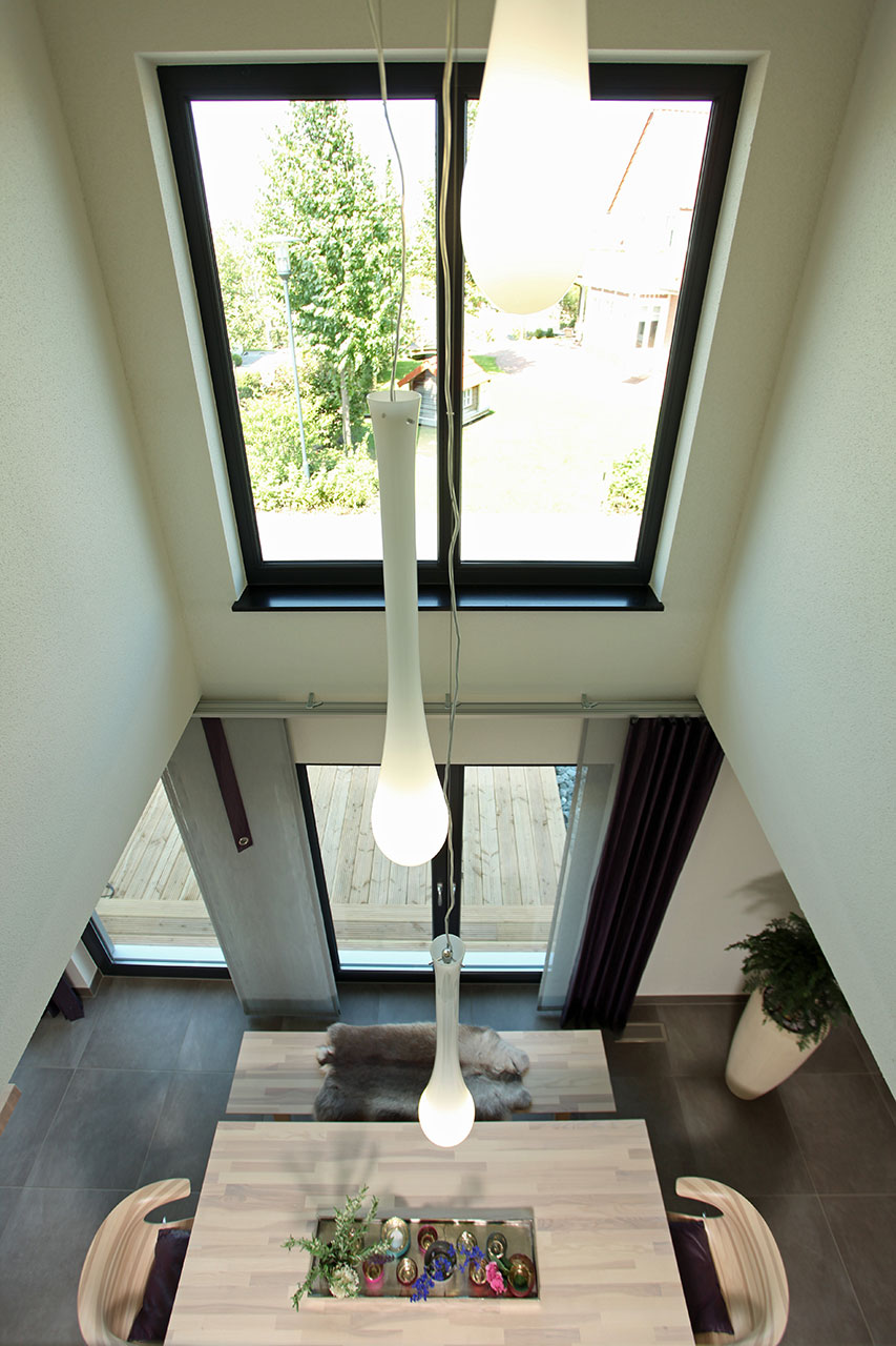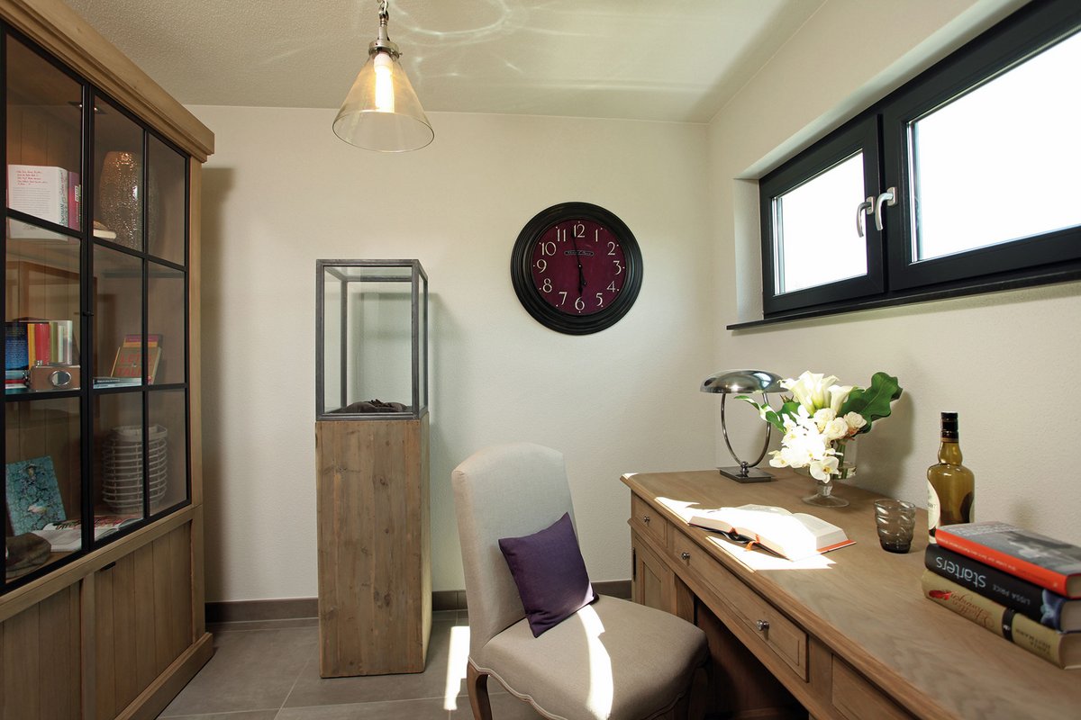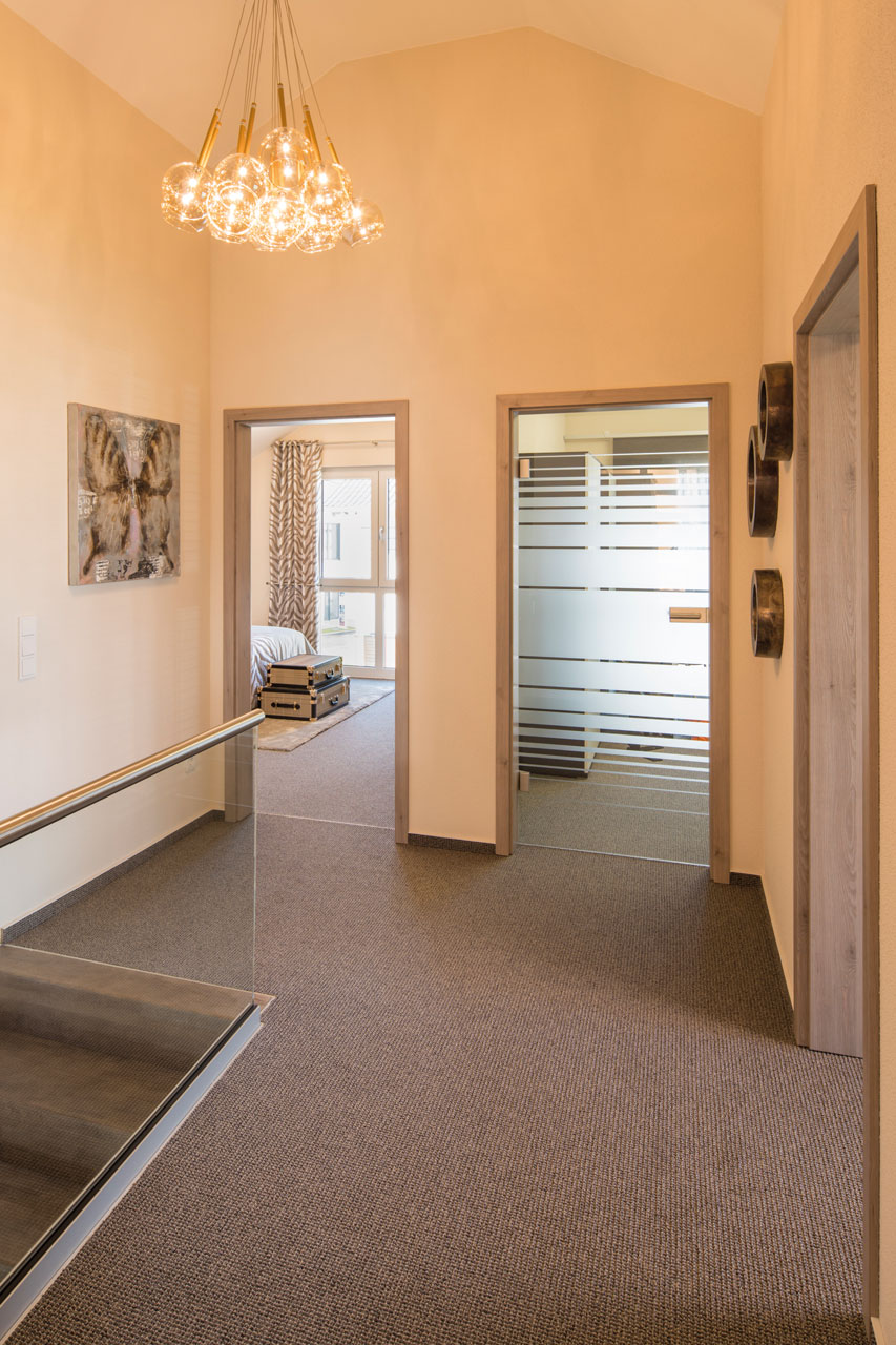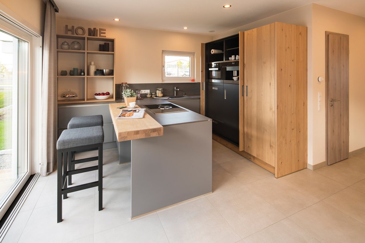 NEO bietet flexible Grundrissideen und ansprechende architektonische Highlights. Die nahtlose Verbindung zwischen dem offenen Arbeitsbereich und dem angrenzenden Wohnzimmer schafft eine harmonische Wohnatmosphäre, während der praktische Abstellraum unter der geraden Treppe zusätzlichen Stauraum bietet. Die Möglichkeit, NEO in zwei verschiedenen Kniestockhöhen (1,30 m und 2,15 m) zu erhalten, ermöglicht es den Bauherren, das Haus an ihre individuellen Bedürfnisse anzupassen.