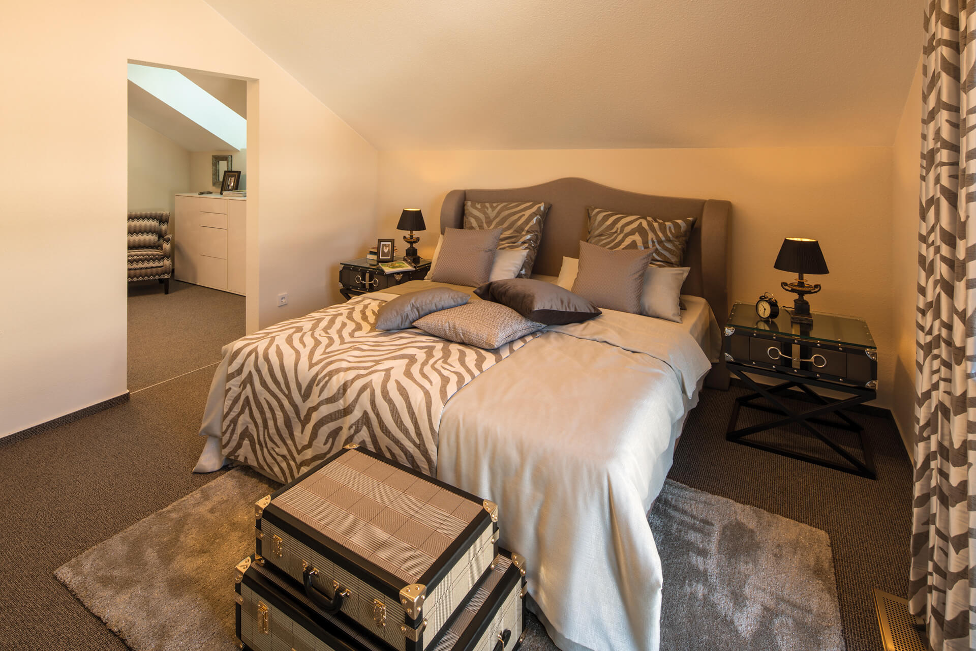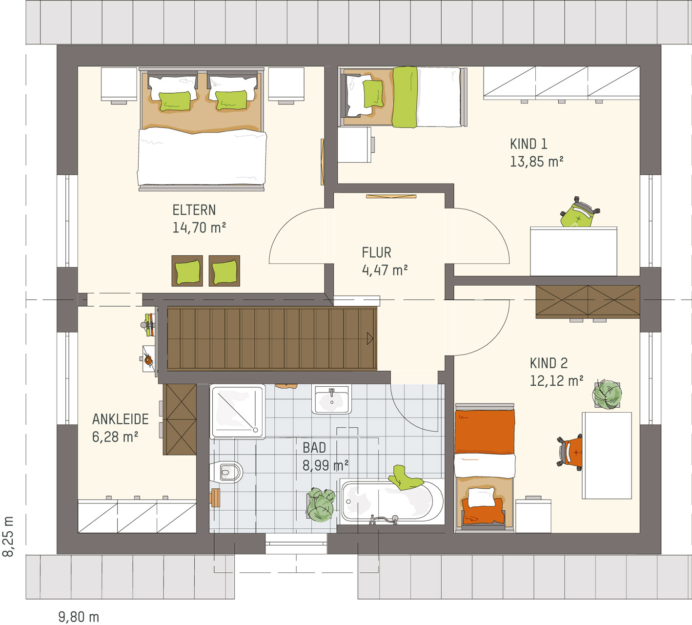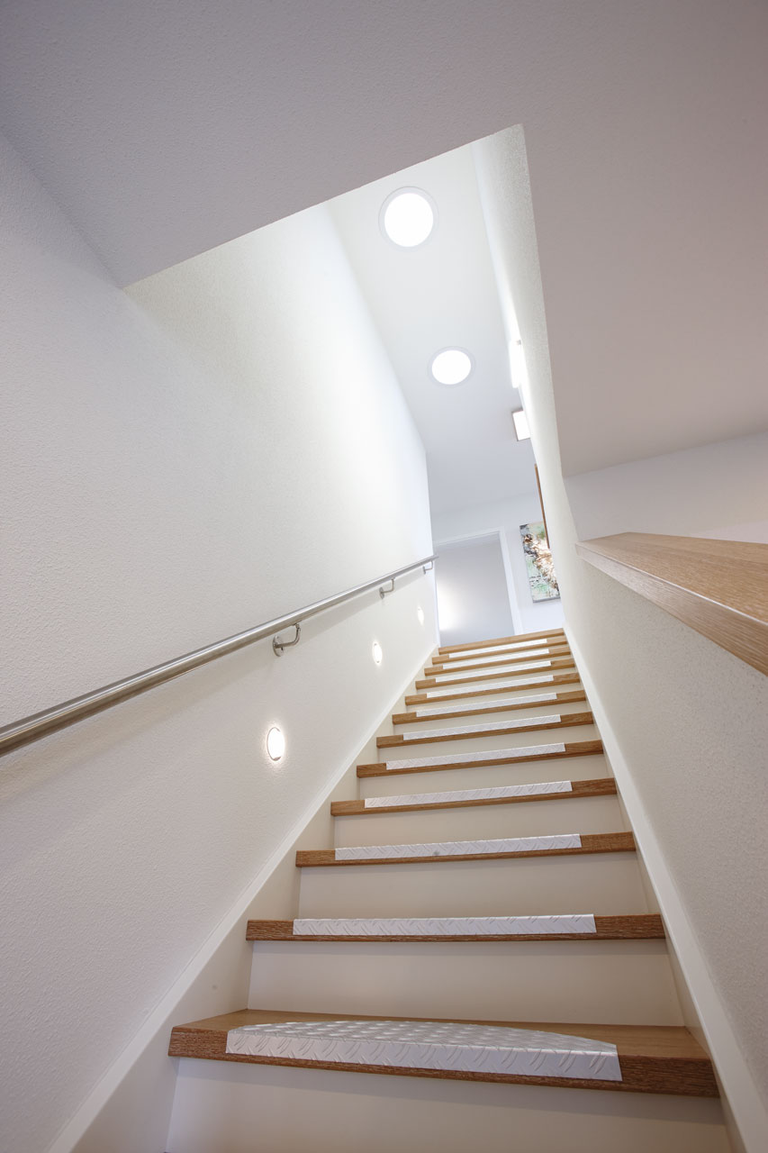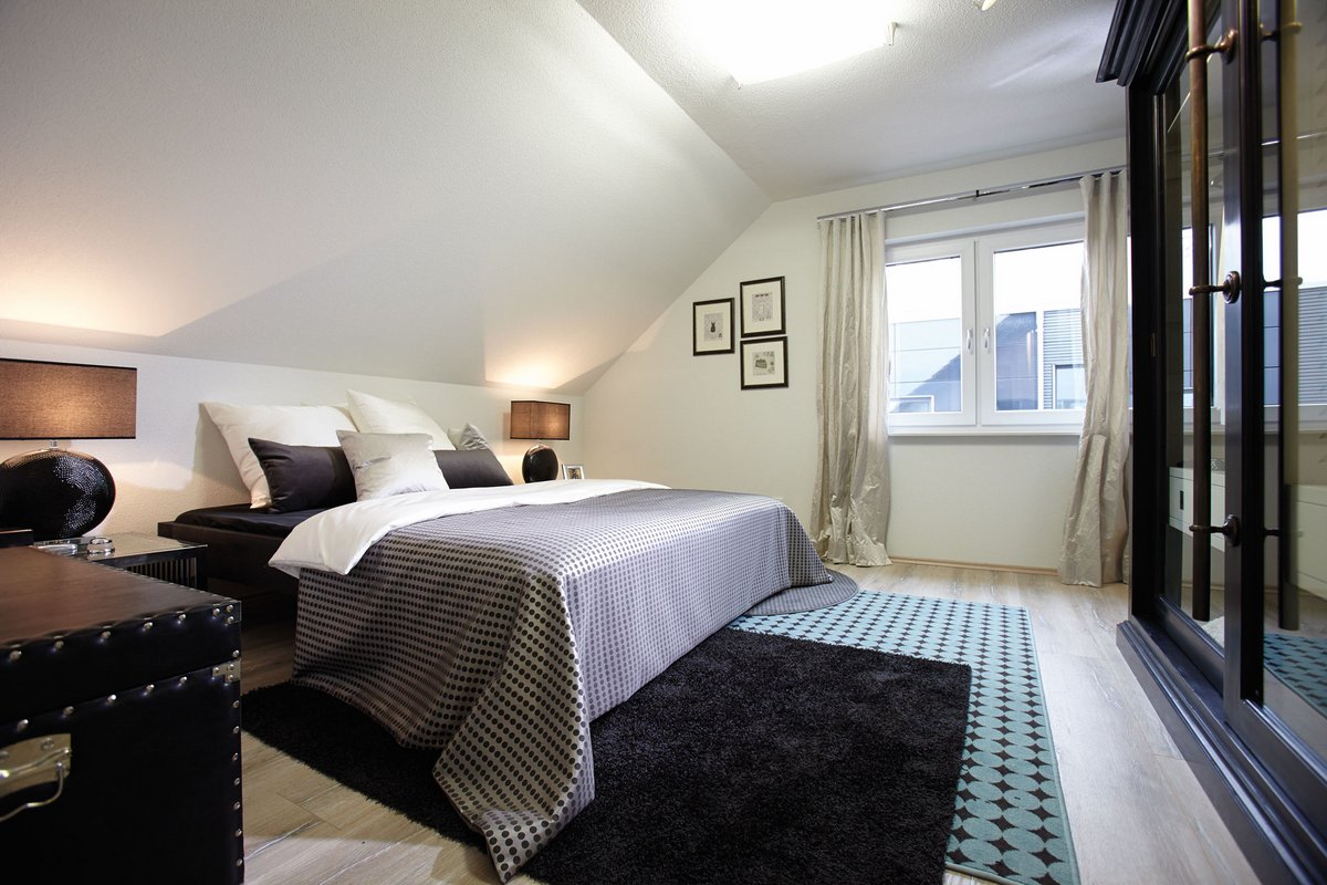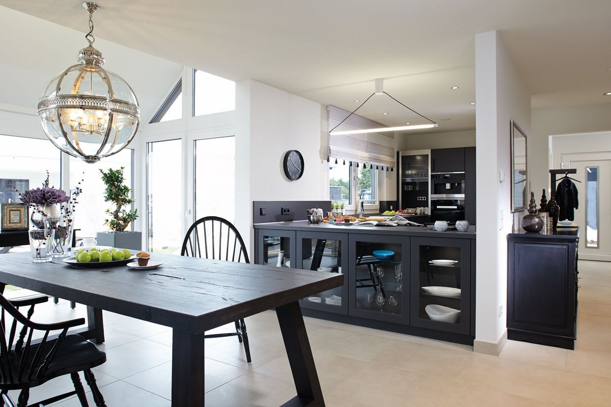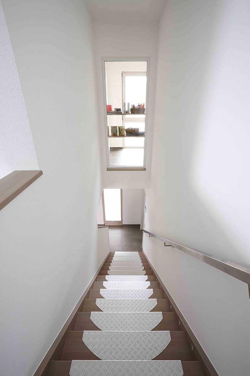 NEO bietet flexible Grundrissideen und ansprechende architektonische Highlights. Die nahtlose Verbindung zwischen dem offenen Arbeitsbereich und dem angrenzenden Wohnzimmer schafft eine harmonische Wohnatmosphäre, während der praktische Abstellraum unter der geraden Treppe zusätzlichen Stauraum bietet. Die Möglichkeit, NEO in zwei verschiedenen Kniestockhöhen (1,30 m und 2,15 m) zu erhalten, ermöglicht es den Bauherren, das Haus an ihre individuellen Bedürfnisse anzupassen.
