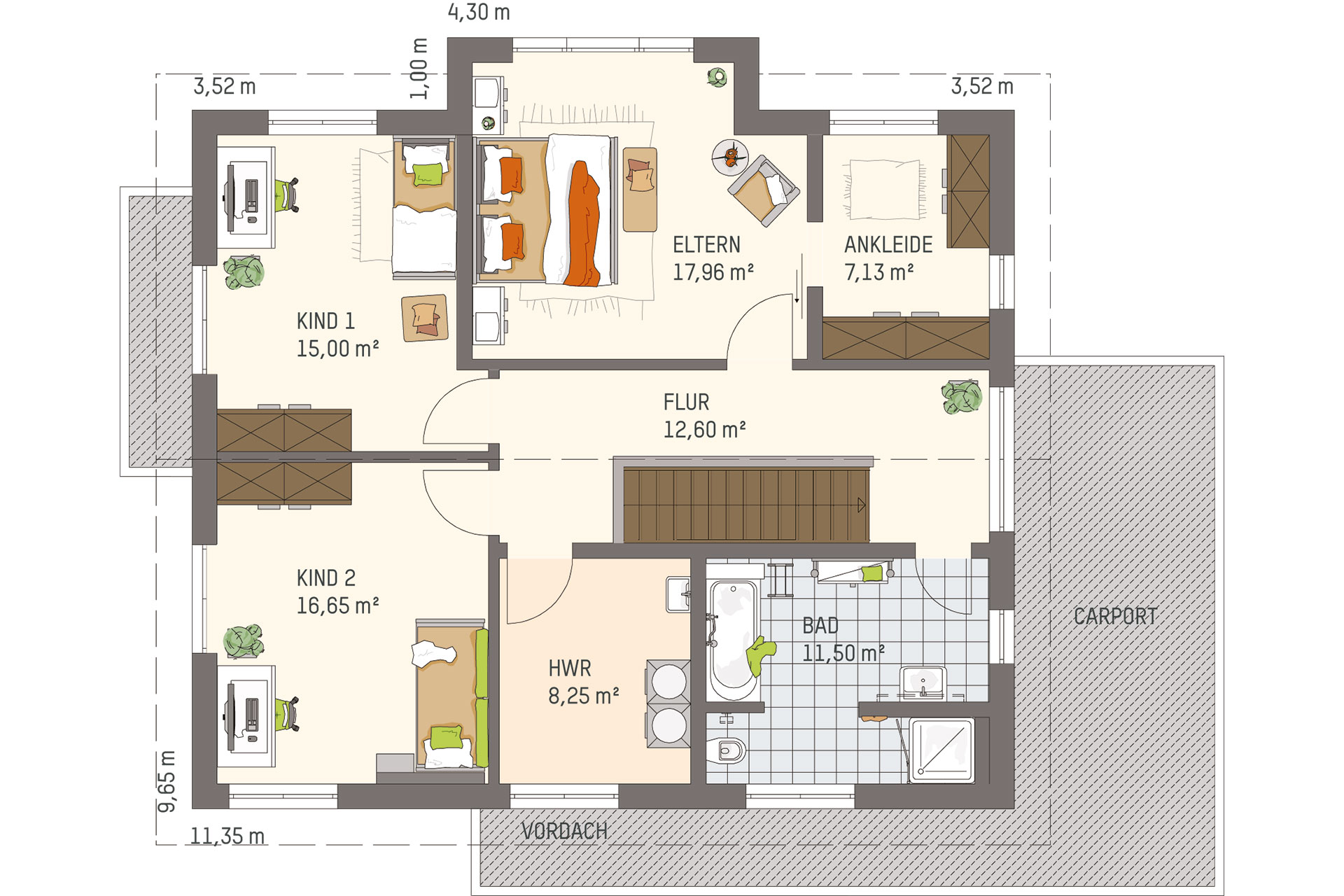 Hinauf ins Dachgeschoss, durch die erste Tür - und schon steht man im geschmackvoll eingerichteten Bad (11,50 m²). Ein halbhoher gefliester Spiegel hinter der ovalen Badewanne mit Standarmatur schützt die Wand, falls die Kinder - oder die Erwachsenen - mal besonders ausgelassen planschen. Der Waschtisch wurde platzsparend an die Duschwand montiert. In der Nische dahinter: die Wellness-Dusche im XL-Format. Auf der anderen Seite der Treppe befindet sich der separate Hauswirtschaftsraum: Waschmaschine und Trockner sind in einer praktischen Einbaunische mit vielen nützlichen Stau- und Ablageflächen und separatem Waschbecken untergebracht. Der perfekte Ort für Wäsche und andere Hausarbeiten. Das Schöne daran: Man kann die Tür einfach schließen und sieht nichts mehr. Neben den beiden großzügigen, von zwei Seiten belichteten Kinderzimmern (15,00 und 16,65 m²) ist natürlich das Elternschlafzimmer (17,96 m²) mit Ankleide (7,13 m²) das Highlight im Dachgeschoss. Das Zimmer profitiert vom Zwerchgiebel, der in diesem Bereich für eine luftige Raumhöhe sorgt. Wobei: Auch in den anderen Räumen muss man keineswegs den Kopf einziehen. Der Kniestock von 2,15 Metern erlaubt es, überall hohe Schränke aufzustellen.