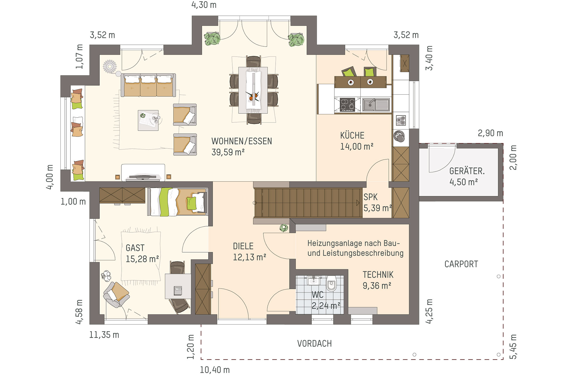 Links von der Diele geht ein geräumiges Gästezimmer mit 15,28 m² ab, das aber auch als Arbeitszimmer genutzt werden könnte. Rechts vom Flur befinden sich das dazugehörige Gäste-WC und der Technikraum. Hier ist neben der Sole-Wasser-Wärmepumpe (Erdwärme) auch die restliche Haustechnik untergebracht. Und wo wird gewaschen und gebügelt? Dafür hat das Haus als besonderen Clou einen separaten Hauswirtschaftsraum im Dachgeschoss - dort, wo sonst die Wäsche anfällt. Der verbundene Wohn-, Ess- und Kochbereich lässt sich nur mit einem Wort beschreiben: beeindruckend! Hier spielt sich das Leben ab - auf knapp 54 m². Um nur ein paar Highlights zu nennen: Links im Erker das bereits erwähnte Sitzbankfenster, davor: die gemütliche Wohnlandschaft. Im Erkerbereich des Quergiebels befindet sich der große Essbereich: An dem rustikalen Tisch aus dunklem Holz kann man wunderbar mit vielen Gästen speisen und dabei den Blick nach draußen genießen. Die angrenzende Küche (14,00 m²) verfügt über eine Arbeitsfläche mit direktem Blick in den Garten und einen schicken Küchentresen mit zwei Essplätzen für das schnelle Frühstück am Morgen oder den Cappuccino am Nachmittag. Praktisch ist die Speisekammer (5,39 m²) unter der Treppe, die direkt von der Küche aus zugänglich ist.