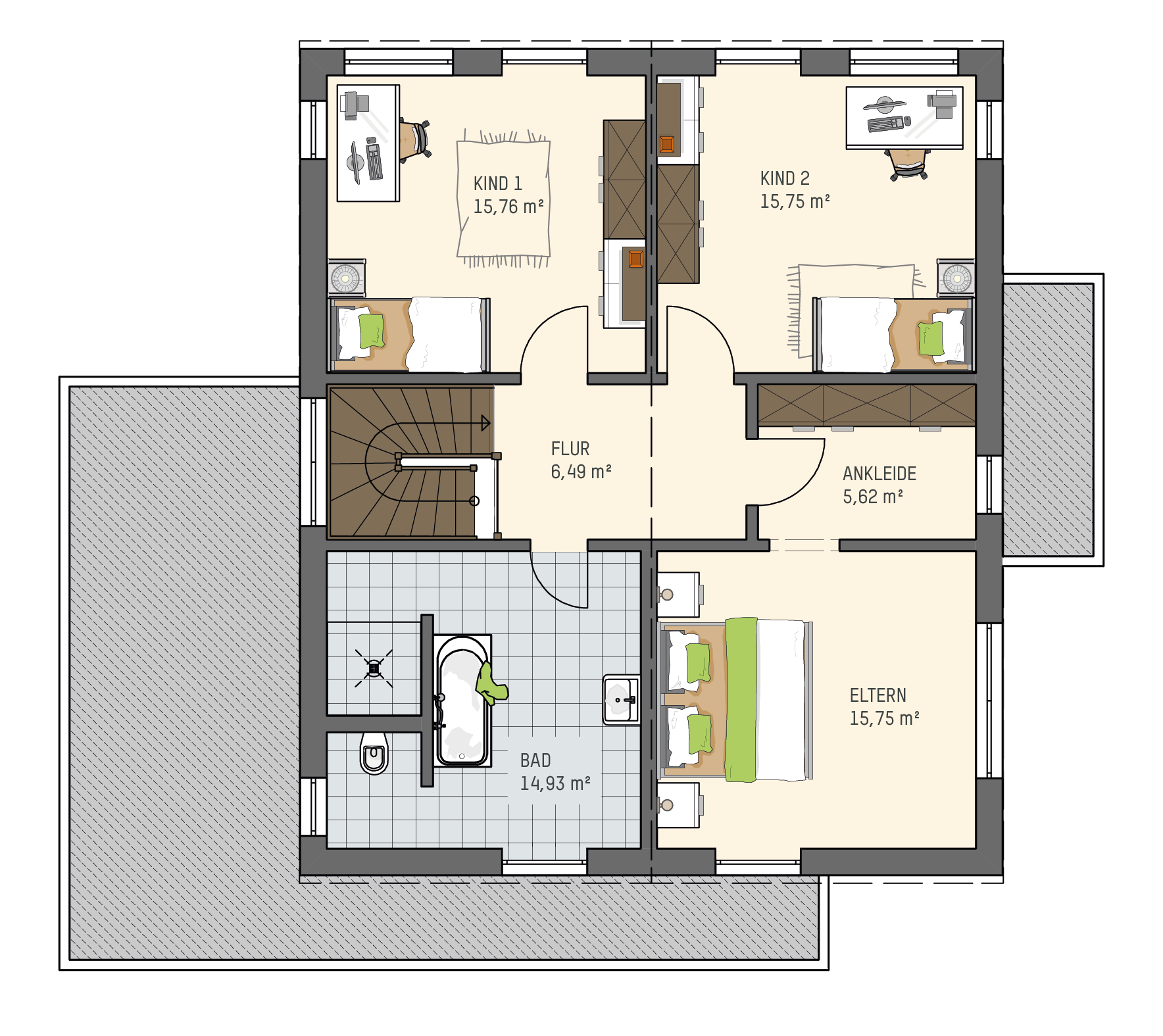 Im Dachgeschoss warten zwei gleich große Kinderzimmer auf ihre neuen Besitzer: Mit 15,61 Quadratmetern Wohnfläche sind sie großzügig dimensioniert. Natürlich kann eines davon, wie im Musterhaus, auch zum Arbeitszimmer umfunktioniert werden. Rechts von der offenen Treppe zeigen die Architekten von MEDLEY 3.0, dass sie verstanden haben, wohin der Trend geht: Das Bad wird zum großzügigen Wellness-Tempel! Auf knapp 15 Quadratmetern sorgen eine freistehende Badewanne in der Mitte des Raumes, eine bodengleiche XL-Dusche, die sich wie das WC hinter einem T-Raumteiler verbirgt, und ein großzügiger Waschtisch für das richtige Luxus-Feeling. Das Elternschlafzimmer betritt man über eine Ankleide, die dem eigentlichen Raum vorgelagert ist: Das ist praktisch, dient als „Lärmpuffer“ zu den Kinderzimmern und ist zugleich herrlich komfortabel.