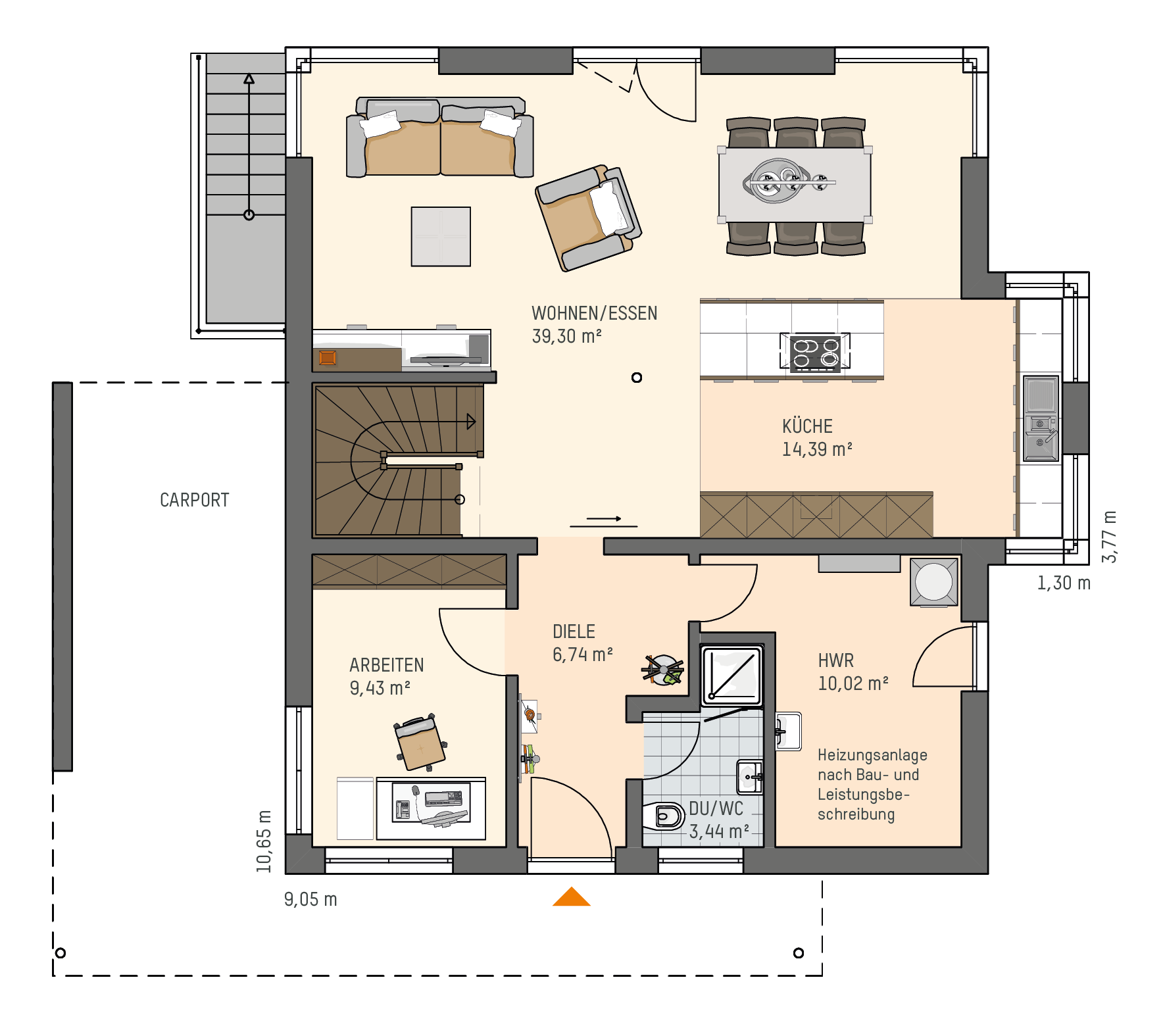 Apropos Platz: Mit insgesamt 152,31 Quadratmetern Wohnfläche nach DIN 277 (davon 78,79 Quadratmeter im Erdgeschoss und 73,52 Quadratmeter im Dachgeschoss) bietet die im UNGER-Park gezeigte Variante des MEDLEY 3.0 300 B reichlich Platz für eine Familie mit zwei Kindern. Die nahezu quadratischen Außenmaße (10,50 x 8,90 Meter) machen es leicht, den Baukörper auf dem Grundstück so zu positionieren, dass Garten- und Straßenorientierung, Sonnenstand und persönliches Wohlbefinden Hand in Hand gehen.