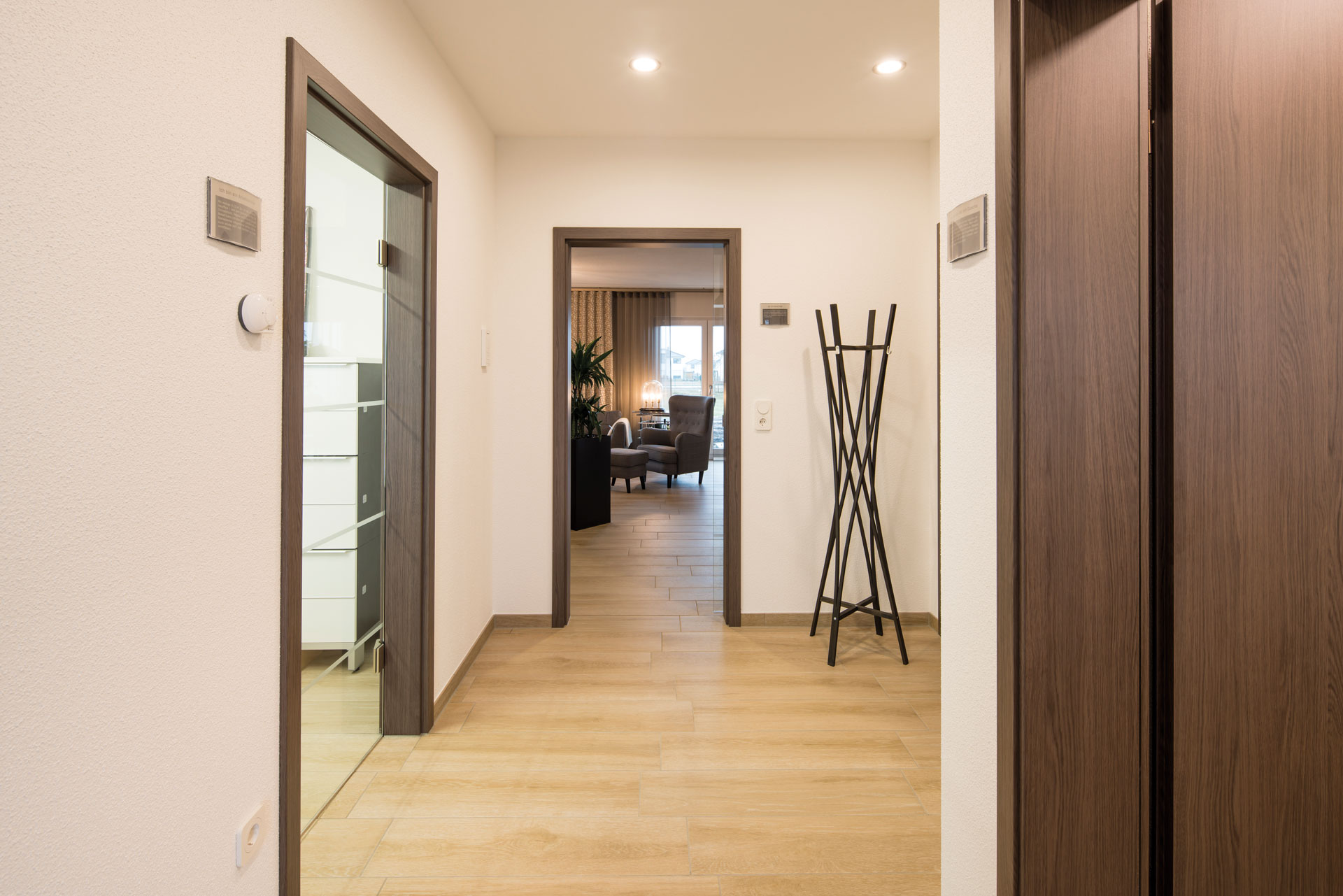 Wohlbefinden stellt sich auch sofort ein, wenn Besucher das neue Musterhaus zum ersten Mal betreten. Links und rechts der Diele befinden sich der Hauswirtschaftsraum, ein Arbeitszimmer, das auch als Gästeraum genutzt werden kann, und ein WC. Praktischerweise ist das Gäste-WC gleich mit einer Dusche ausgerüstet. Witzig: die großformatigen Fliesen mit Kuhfellmuster, die sich auch im großen Badezimmer im Dachgeschoss wiederfinden. Von der Diele aus öffnet sich das kombinierte Wohn-Ess-Zimmer mit offener Küche per Schiebetür: Über 50 Quadratmeter verteilen sich hier auf wohldurchdachte Bereiche zum Kochen, gemeinsamen Essen und gemütlichen Relaxen im Wohnbereich. Die Küche ist mit modernsten Geräten ausgestattet und der Kochtresen eignet sich als kommunikativer Lieblingsplatz fürs gemeinsame Kochen oder den schnellen Kaffee zwischendurch.