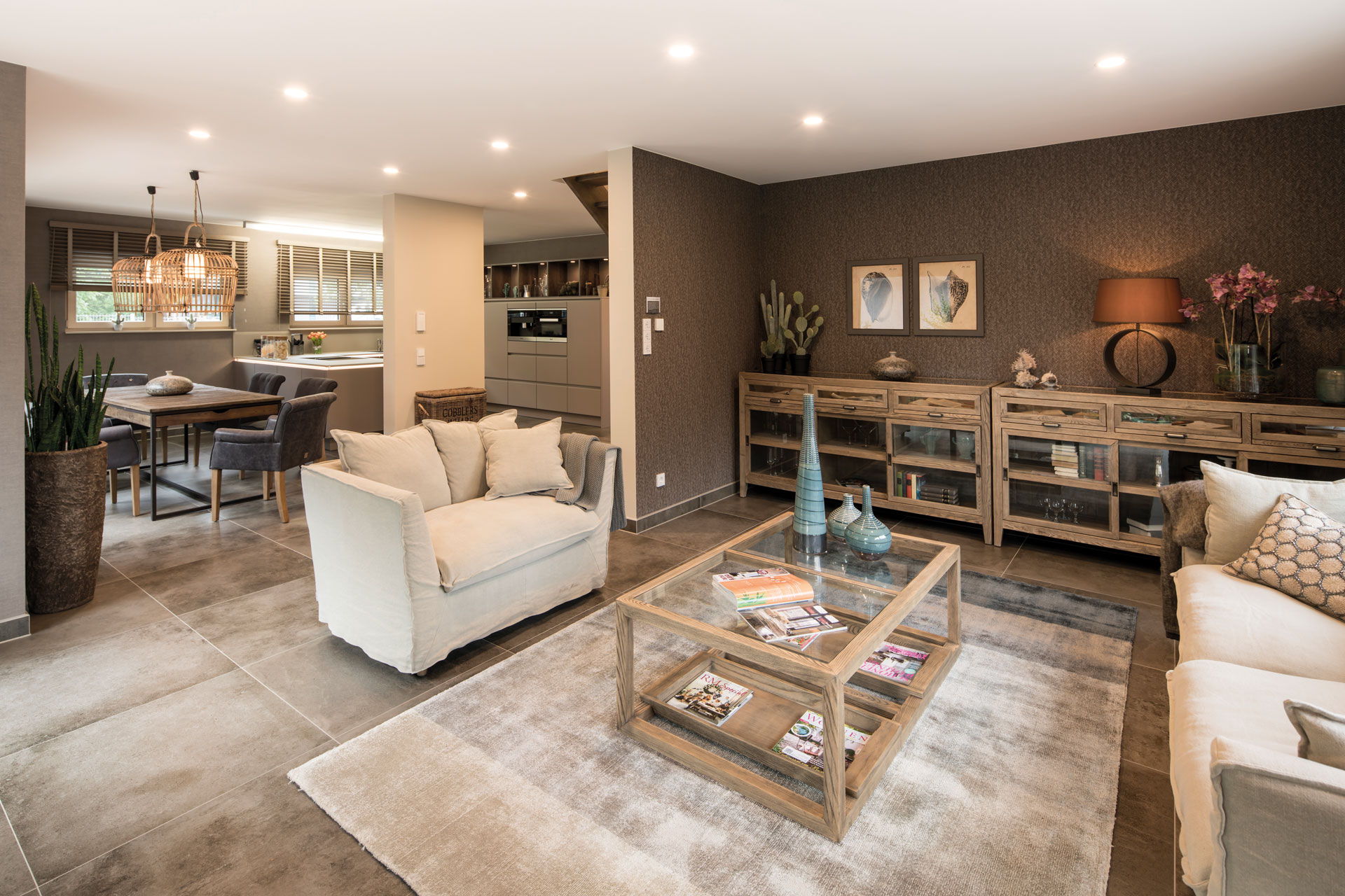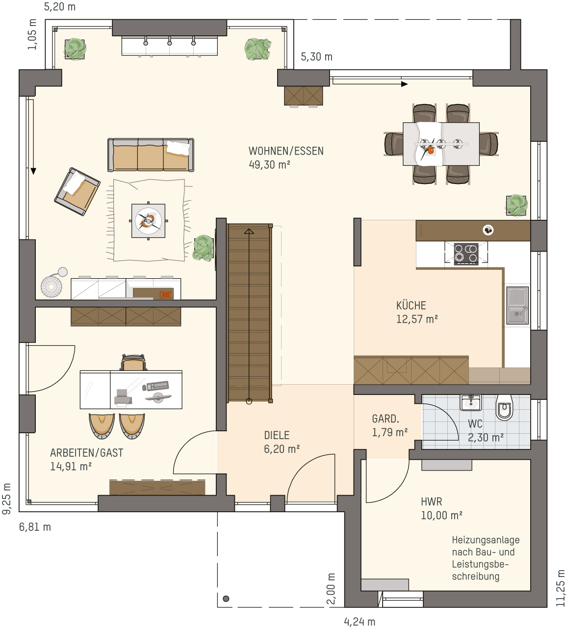 Der Grundriss wurde sorgfältig geplant: Von der Diele aus geht es links in ein nahezu quadratisches Arbeits- oder Gästezimmer, rechts gelangt man über eine praktische Garderobennische in das WC und den Hauswirtschaftsraum. Auf fast 50 Quadratmetern präsentiert sich das Wohn-Ess-Zimmer mit zwei Highlights: dem von Eckverglasungen eingerahmten Erker und dem Essbereich vor der überdachten Terrasse. Die Küche ist nahtlos, aber etwas zurückversetzt, in den großen Bereich integriert.