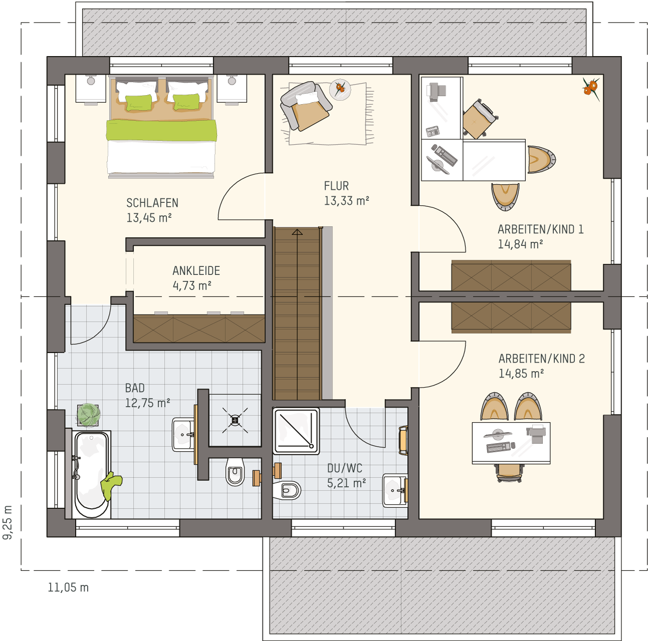 Im Dachgeschoss befinden sich zwei gleichgroße Kinder- oder Arbeitszimmer sowie ein separates Duschbad. Links der Treppe geht es in den „Elterntrakt“: Er besteht aus Schlafraum, Ankleide und En-suite-Badezimmer. Die Ankleide ist purer Luxus und hält das Schlafzimmer frei von Schränken. Das Badezimmer bietet eine große Badewanne, ein WC und eine bodengleiche Dusche. Hier im Dachgeschoss spielt auch der hohe Kniestock von 2,15 Metern seine Trümpfe aus: Größere Sideboards oder Schränke finden überall einen Platz.