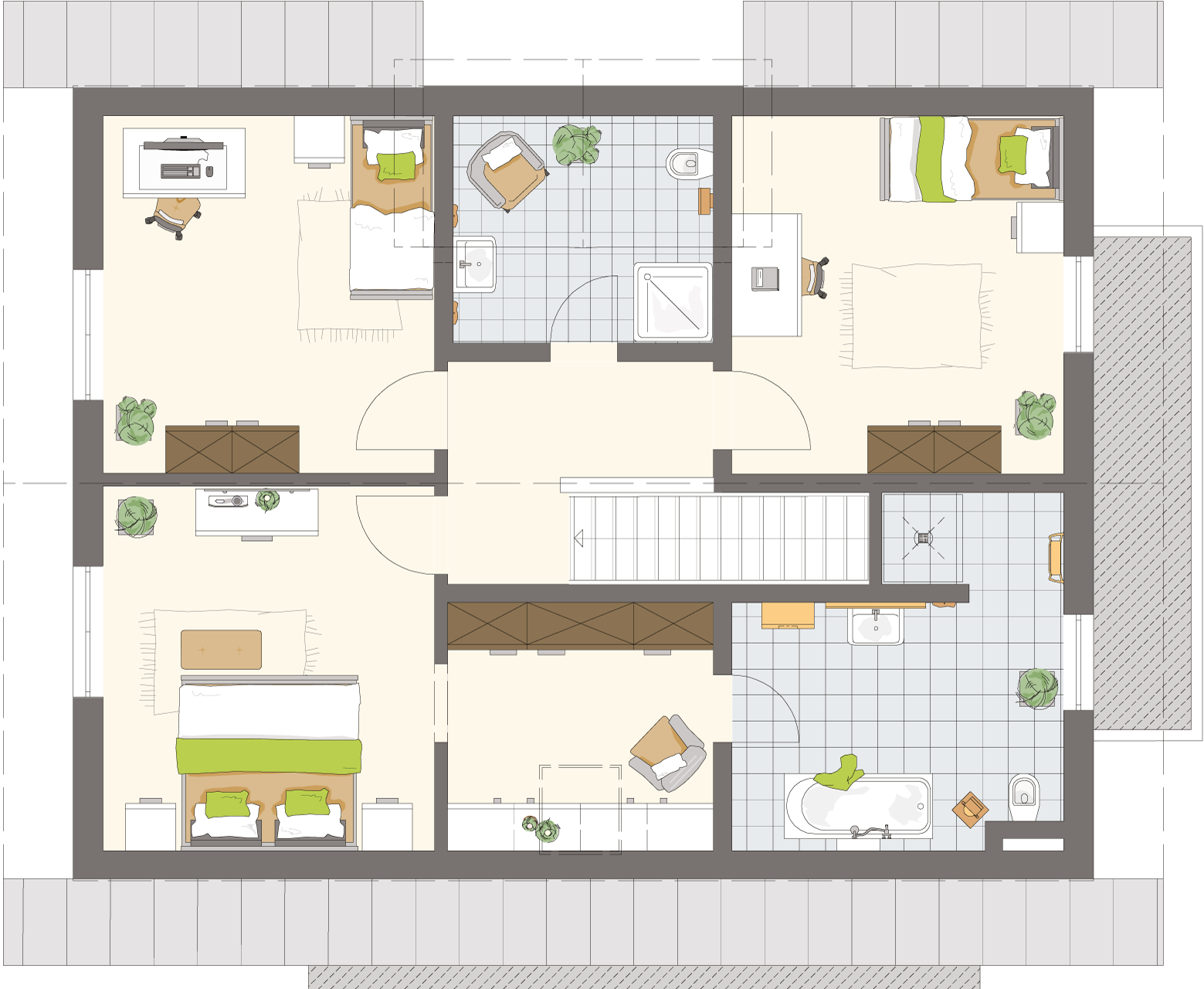 Besonders Familien werden sich über die klare Raumordnung im Dachgeschoss (82,44 m²) freuen: Rechts der Treppe liegt der „Kinderbereich“ mit zwei ungefähr gleich großen Zimmern und einem schönen Duschbad. Der „Elternbereich“ gliedert sich in drei hintereinanderliegende Räume: Schlafzimmer, Ankleide und Badezimmer. Das Bad punktet mit freistehender Badewanne, Doppelwaschtisch und bodengleicher Dusche. Ein Raum zum Entspannen – auch wenn es im Haus einmal hoch hergeht.