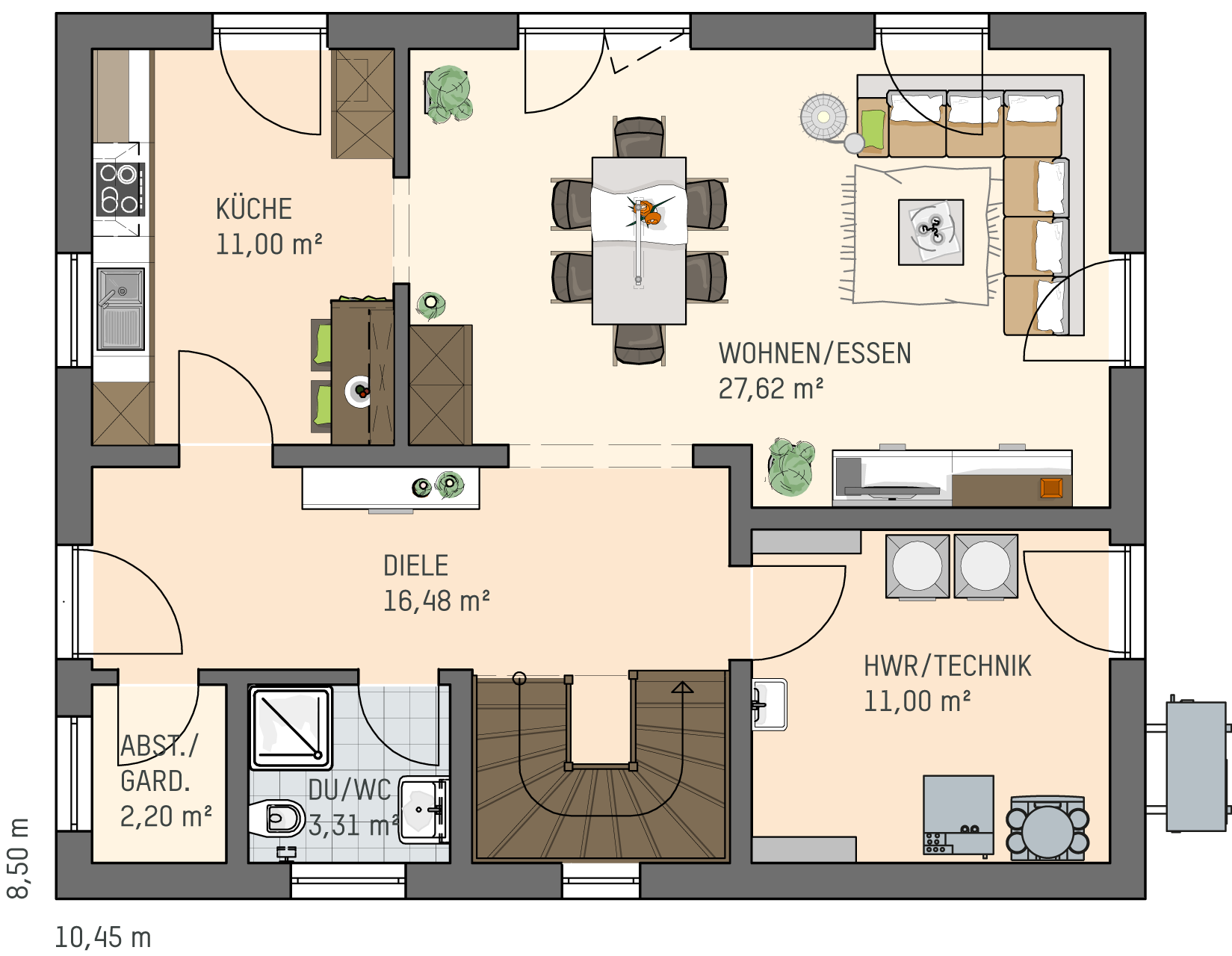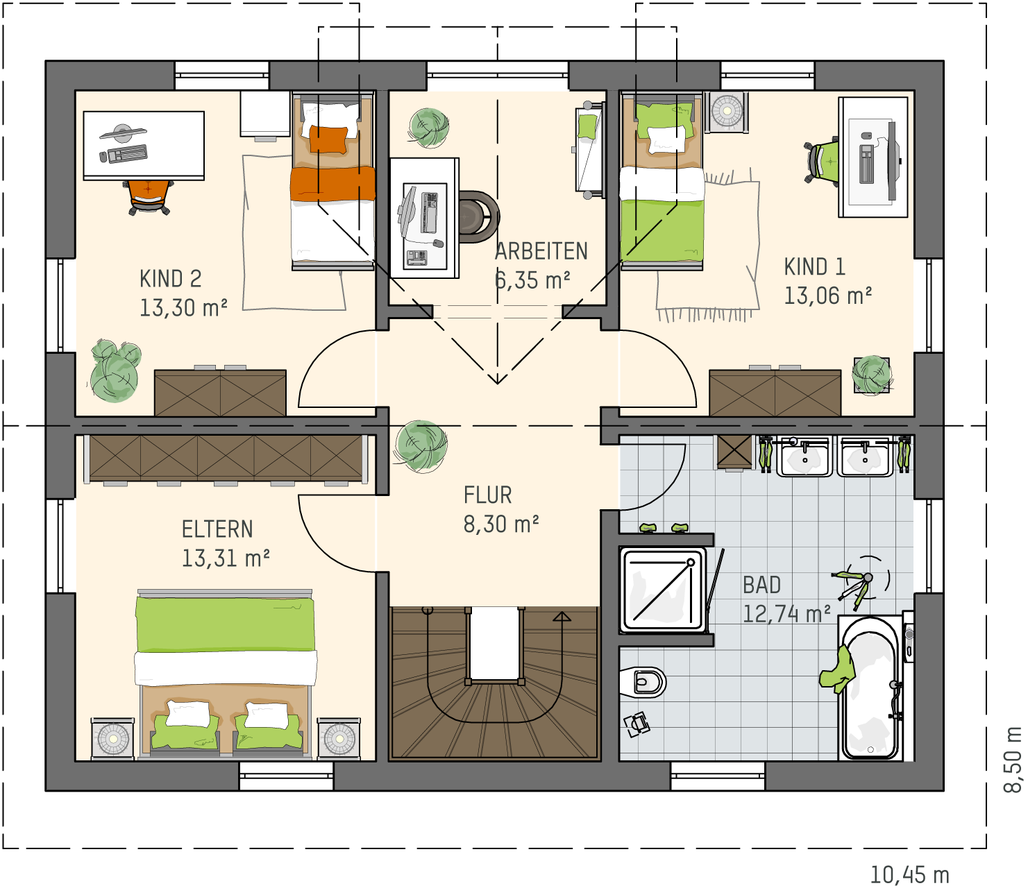 Insgesamt bietet das Musterhaus UNO 2.0 eine Wohnfläche von 138,67 Quadratmetern (EG: 71,61 Quadratmeter, DG: 67,06 Quadratmeter nach DIN 277) und mit seinen kompakten Maßen genügend Platz für eine vierköpfige Familie. Die Küche im Erdgeschoss befindet sich in einem separaten Raum, aber ein Durchgang ermöglicht den schnellen Wechsel in das knapp 28 Quadratmetergroße Wohn-Esszimmer. Highlight im Dachgeschoss ist das Arbeitszimmer unterm Quergiebel. Zwei gleich große Kinderzimmer bieten mit 13,30 Quadratmetern viel Platz zum Spielen.