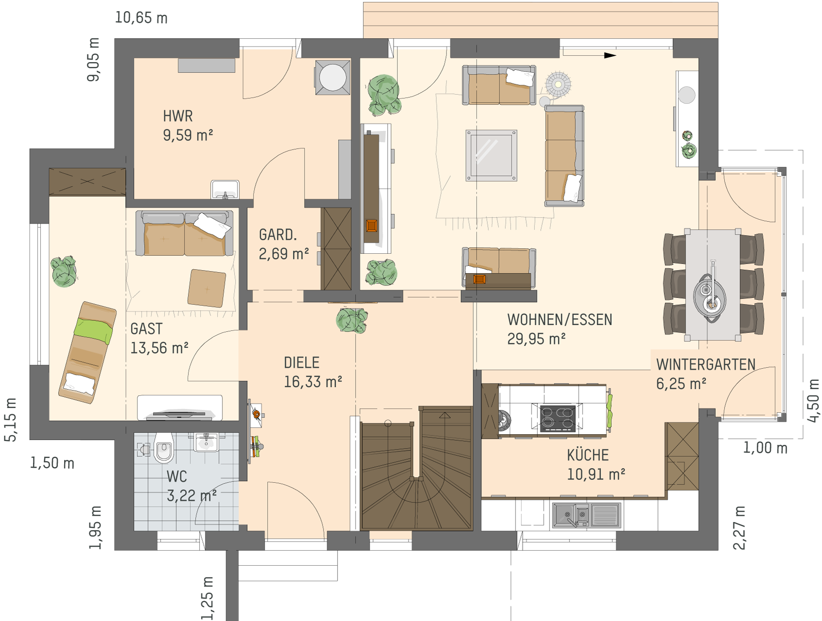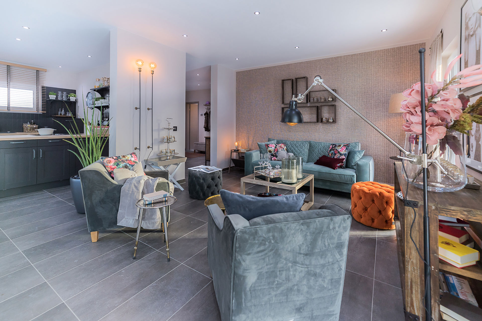 Mit einer Wohnfläche von 166,87 m2 (EG: 92,50 m2, DG: 74,37 m2 nach DIN 277) bietet das Einfamilienhaus ausreichend Platz für eine vierköpfige Familie und hat sogar noch Raumreserven für ein Gästezimmer, ein Homeoffice – oder weiteren Nachwuchs. Drei gut geschnittene Räume im Dach- und ein weiteres Zimmer im Erdgeschoss von jeweils 14 bis 16 m2 sind flexibel nutzbar. Vor allem aber bietet die Wohnetage mit großzügiger Diele und einem geradezu üppigen Wohn-/Ess- und Kochbereich von insgesamt 40 m2 viel Platz für ein lebendiges Miteinander. Highlight in diesem Bereich ist der Essplatz im Wintergarten, hell und mit direkter Anbindung an den Garten. Ein schönes Detail im Gästezimmer: das „Gemütlichkeitsfenster“. Dabei handelt es sich um das Fenster im Erker, dessen Fensterbank zu einer behaglichen Sitzbank vergrößert wurde. Ein wunderbarer Ort zum Lesen, Kuscheln, Handarbeiten oder einfach nur Relaxen – obendrein mit tollem Blick in den Garten. Aber nicht nur ans Wohlfühlen wurde bei der Planung gedacht, auch die praktischen Aspekte überzeugen. So schließen an die Diele eine Garderobe und ein großer Hauswirtschaftsraum an. Im Alltag sind es gerade diese Lösungen, die das Leben erleichtern.