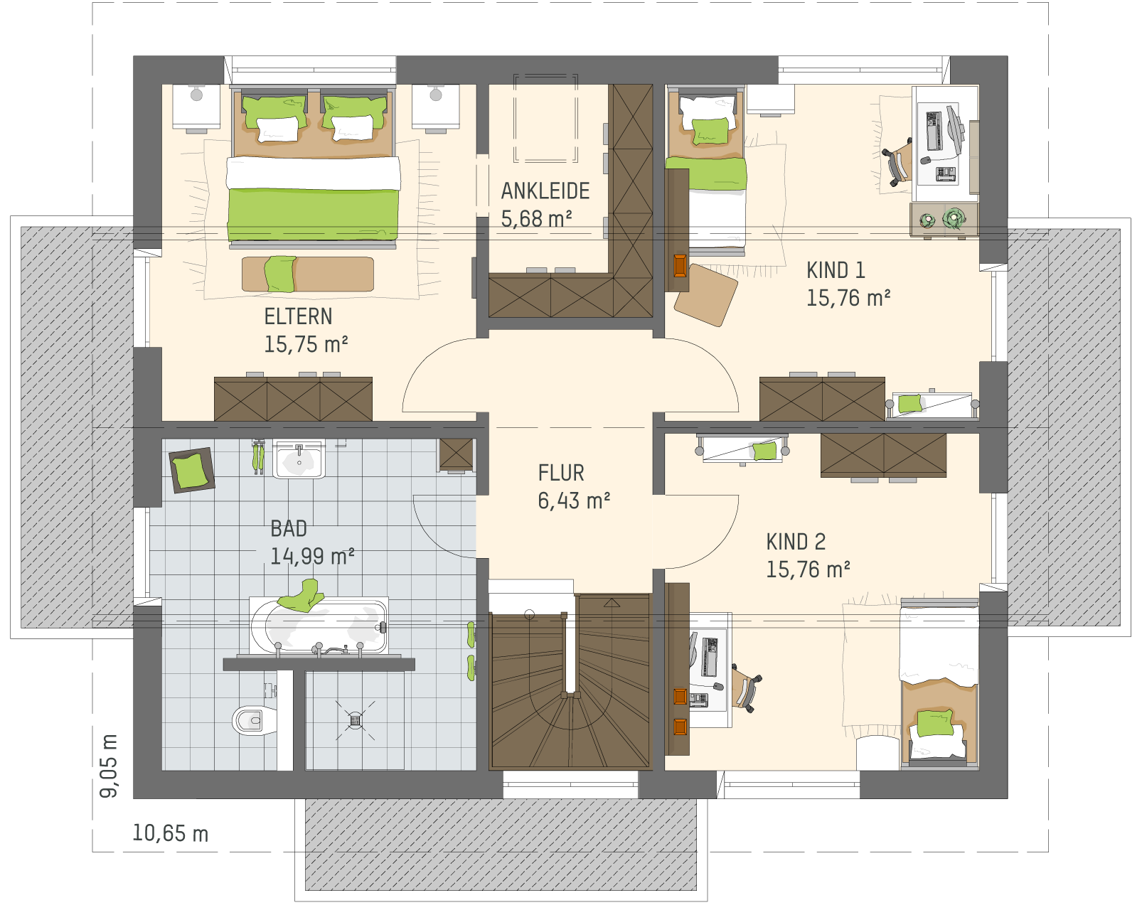 Aus der Diele führt die halbgewendelte Treppe ins Dachgeschoss mit den drei Rückzugsräumen, jeweils ca. 16 m2 groß. Das Elternschlafzimmer bietet eine exklusive Besonderheit: eine separate Ankleide, dank eines Dachflächenfensters gut belichtet. Es sind diese Special Effects, die einem Haus das besondere Etwas verleihen und das Lebensgefühl wunderbar bereichern. Ebenso intelligent geplant: das große Familienbad. Es begeistert nicht nur mit Badewanne und großer bodengleicher Dusche, sondern auch mit einer Innenarchitektur, die bei aller Großzügigkeit Intimität schafft: WC und Dusche sind in Nischen untergebracht.