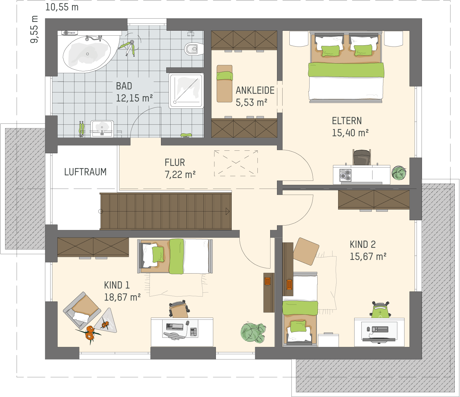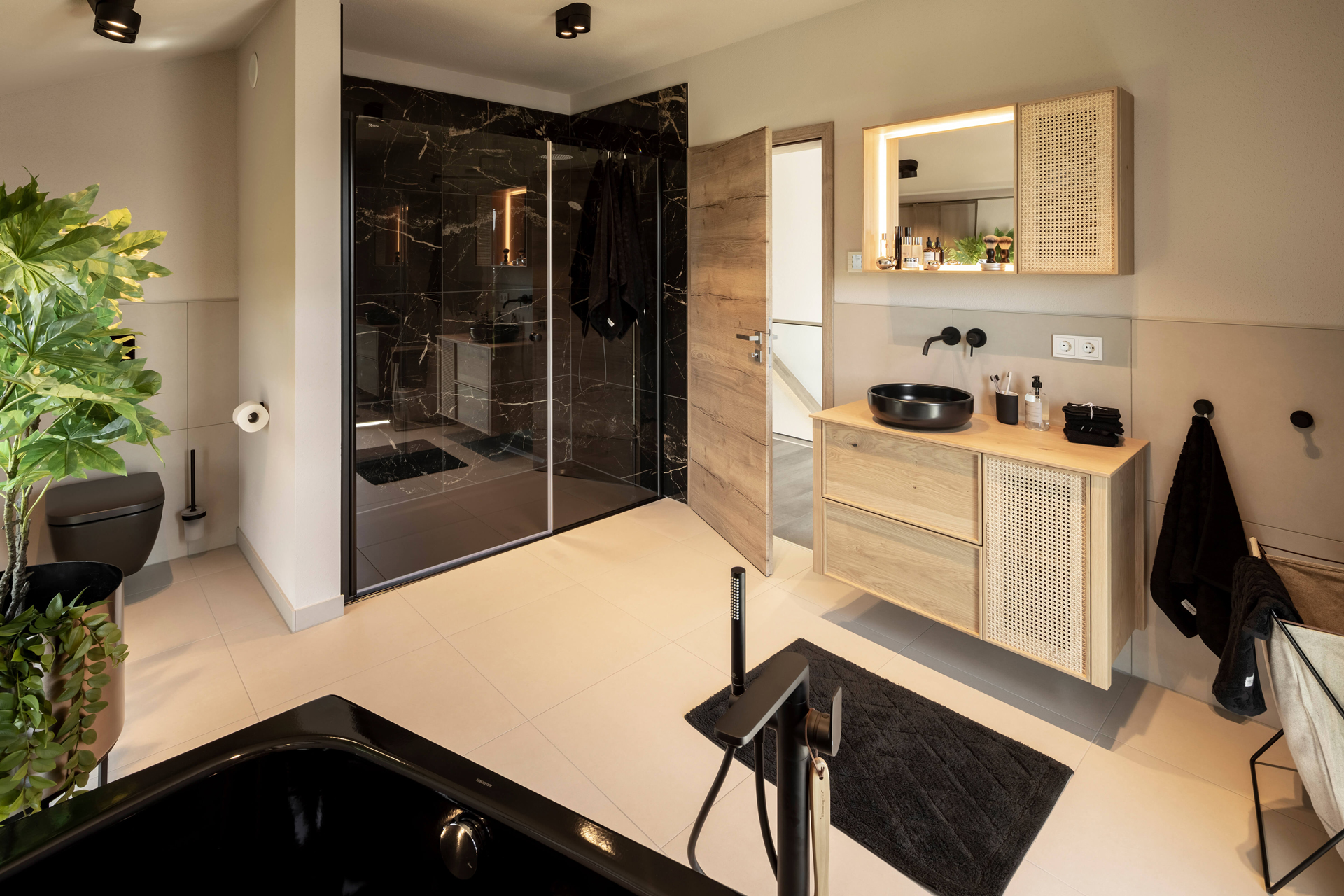 Ins Dachgeschoss (74,64 Quadratmeter) geht es über eine gerade Wangentreppe in keilgezinkter Eiche. Von hier gelangt man in einen kleinen Flur (7,22 Quadratmeter). Die Kinderzimmer (18,67 Quadratmeter und 15,67 Quadratmeter) profitieren wie alle Räume im Dachgeschoss vom hohen Kniestock. Zwar sind die Dachschrägen ab 2,15 Metern sichtbar und sorgen für deren typische gemütliche Ausstrahlung, aber sie lassen den Bewohnern trotzdem alle Freiheiten für die Möblierung. Individuellen Schranklösungen sind hier also kaum Grenzen gesetzt. Das große Elternschlafzimmer (15,40 Quadratmeter) bietet einen direkten Zugang zur Ankleide (5,53 Quadratmeter). Sie sorgt dafür, dass der schranklose Schlafraum sehr luftig möbliert werden kann. Ein regelrechtes Wellnessbad (12,15 Quadratmeter) mit besonderen gestalterischen Akzenten befindet sich ebenfalls im Dachgeschoss. Beige und Schwarz geben hier den Ton an und bilden einen Kontrast mit der vollverglasten, bodengleichen Dusche und dem Waschtisch sowie wandhängendem Spiegelschrank aus hellem Holz. Die Einrichtungsexpertinnen und -experten der FingerHaus-Schwesterfirma FingerHome haben im Bad großformatige Bodenfliesen in der Farbe „Factory Beige“ mit einer schwarzen Eckbadewanne, einem schwarzen Waschbecken, schwarzem WC sowie schwarz-marmorierten Fliesen „Glory Marble“ im Duschbereich kombiniert.
