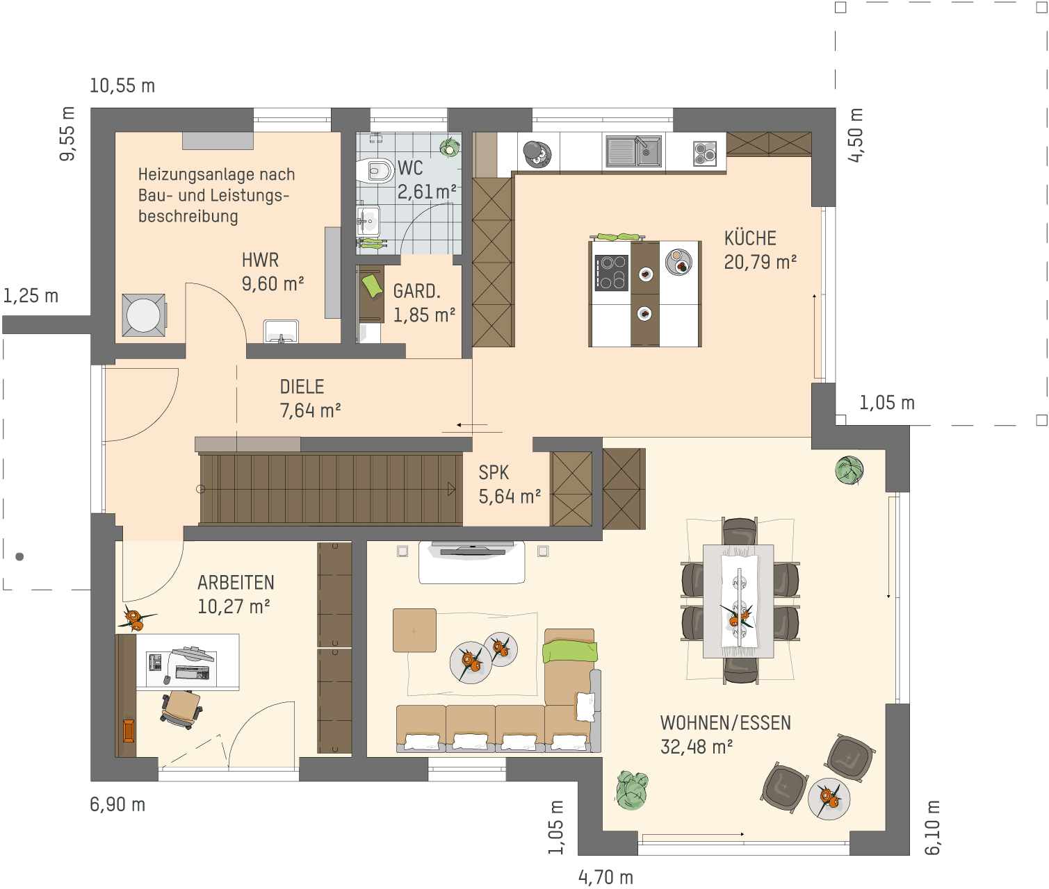 Beim Betreten der Diele (7,64 Quadratmeter) kann der Blick der Besucher ungehindert über die Küche bis in den Garten schweifen. Möglich macht dies der offen gestaltete Grundriss ohne Zwischentüren. Nichts verstellt die schöne Aussicht. Direkt im Eingangsbereich entsteht ein großer Luftraum, der von der Diele aus den Blick bis ins Dachgeschoss ermöglicht und für ein ganz besonders großzügiges Raumgefühl sorgt. Zwei praktische Räume gehen von der Diele ab. Ein Hauswirtschaftsraum (9,60 Quadratmeter) hält neben der Haustechnik viel Platz für Waschmaschine und Trockner sowie weiteren wertvollen Stauraum bereit. Im Arbeitszimmer (10,27 Quadratmeter) können sich die Bewohner gut konzentrieren und ungestört in Videokonferenzen Kontakt zu Kollegen und Kunden halten. Der Raum lässt sich natürlich vielfältig nutzen – auch als Gästezimmer. Auf halbem Weg von der Diele in die Küche befindet sich eine wunderbar vor Blicken verborgene Garderobennische (1,85 Quadratmeter), in deren Verlängerung ein Gäste-WC liegt. Die ganz besonders praktische Abstell- oder Speisekammer befindet sich unter der geradeläufigen Treppe ins Dachgeschoss. Der zusätzliche Stauraum mit 5,64 Quadratmetern ist an dieser Stelle, in der Mitte des Erdgeschossgrundrisses, mehr als willkommen.