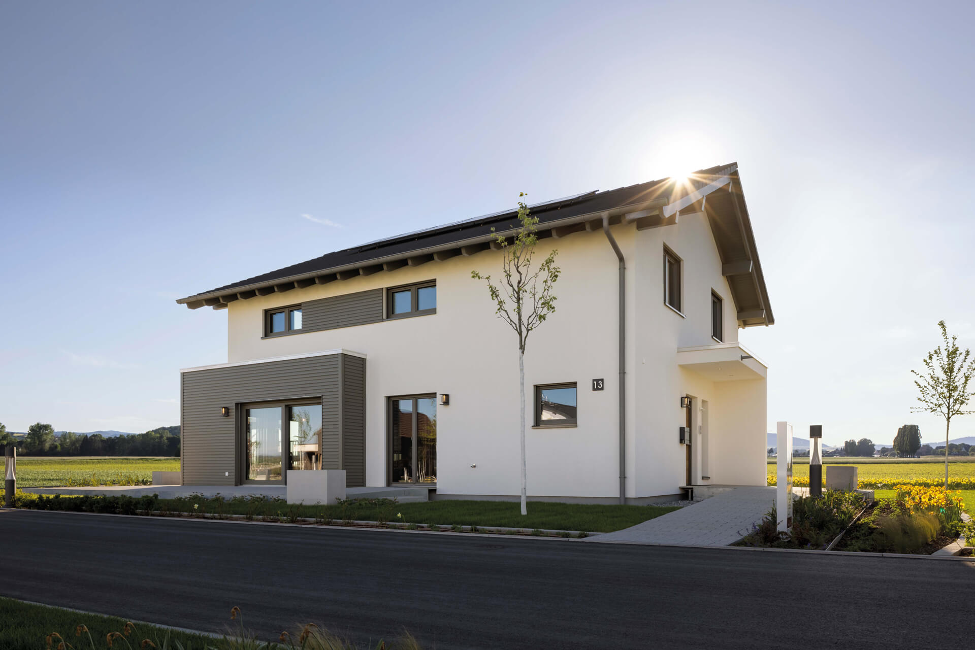Das ARTIS 400 ist mit einem klassischen Satteldach, 25 Grad Dachneigung und 2,15 Meter hohem Kniestock gebaut. Der Rohstoff Holz spielt nicht nur bei der Konstruktion des ARTIS eine große Rolle, sondern auch bei vielen Fassadendetails. Der Erker ist mit einer quarzgrauen Holzverschalung versehen, die einen schönen Kontrast zur weißen Putzfassade erzeugt. Die Holzverschalung des Erkers wiederholt sich als Verbindungselement zwischen den quarzgrauen Holz-Aluminium-Fenstern an den Traufseiten. Eine optische Besonderheit bildet das Haustürvordach mit Wandscheibe, das farblich an die Putzfassade angepasst ist und allen Besucherinnen und Besuchern einen geschützten Eintritt ermöglicht.