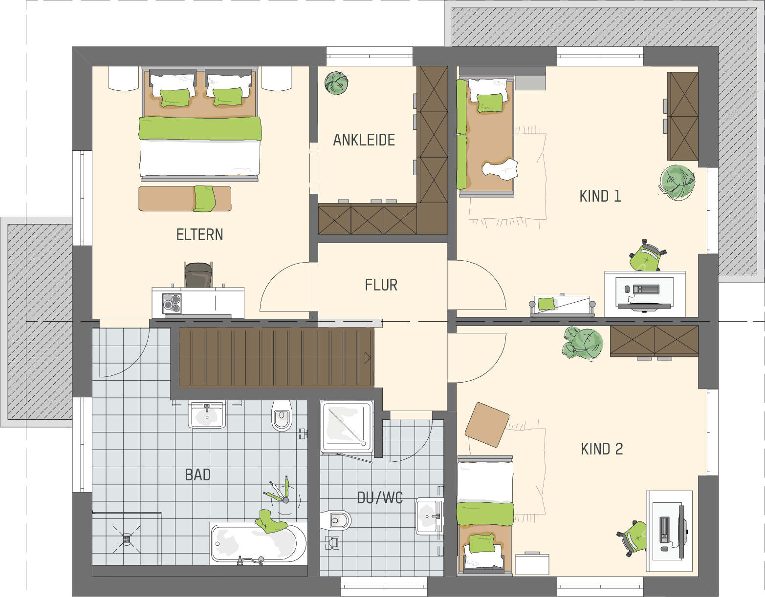 Das Dachgeschoss erstreckt sich über 83,37 m² und hält viel Platz für vier Personen bereit. Die FingerHaus-Architekten haben bei der Grundrissplanung an die besonderen Bedürfnisse von Familien gedacht. Die Kinder können sich über zwei gleichgroße Zimmer freuen, die dank bodentiefer Fenster und der Extraportion Tageslicht von zwei Seiten hell und einladend wirken. Neben dem Treppenaustritt befindet sich ein Duschbad, dass sich hervorragend als Kinderbad eignet. Die Eltern verfügen über ihr eigenes Reich im Dachgeschoss, das vom Kindertrakt entkoppelt ist. An das Schlafzimmer schließen sich zwei separate Räume an. Auf der einen Seite betritt man die Ankleide, auf der anderen Seite geht es in das geräumige Badezimmer.