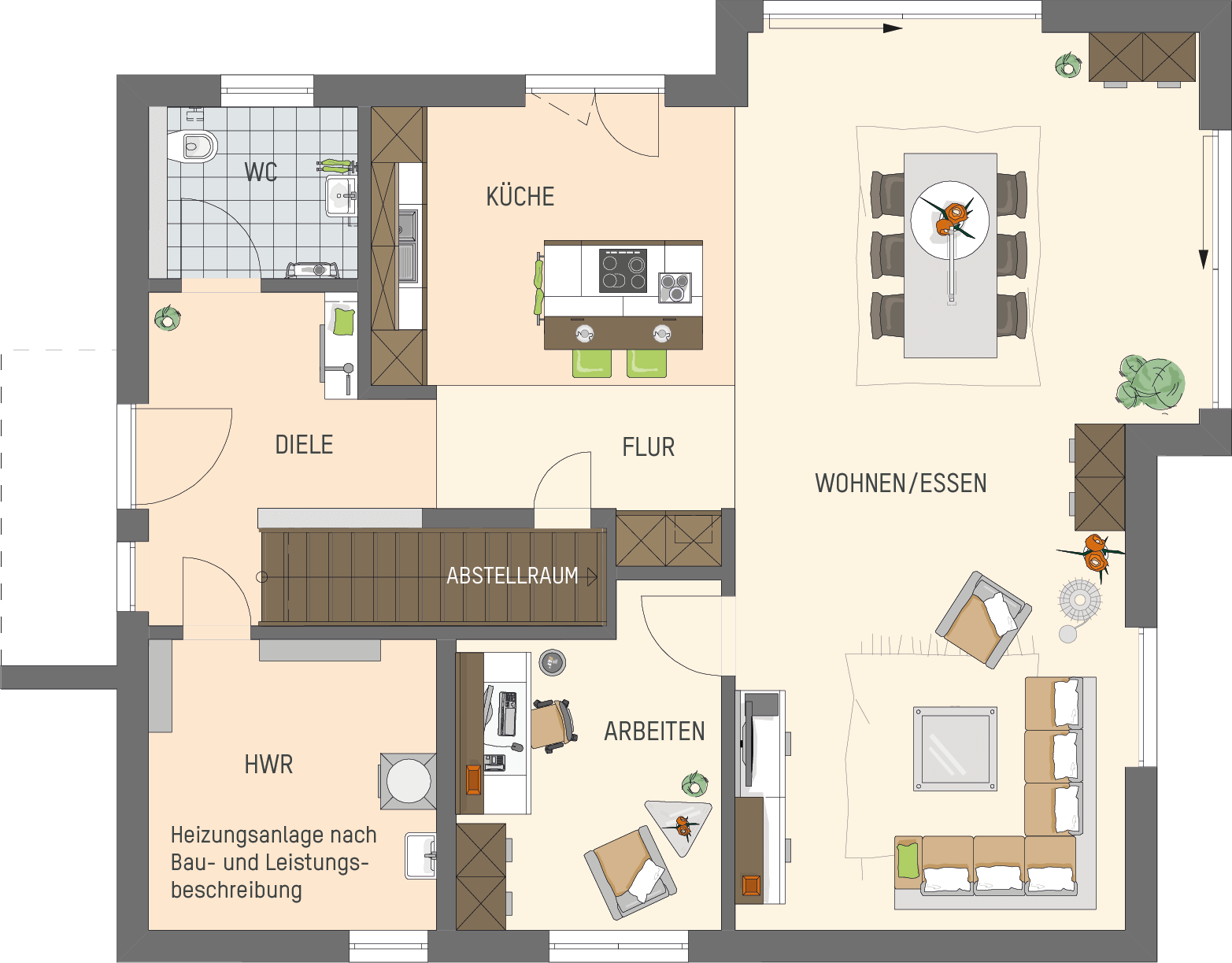 Wer das Musterhaus betritt, kann von der Diele aus durch den Koch- und Wohnbereich direkt in den Garten schauen. Die Sichtachse verläuft quer durchs Erdgeschoss und bietet einen schönen Aus- und Durchblick. Von der fast zehn Quadratmeter großen Diele geht es seitlich ins Gäste-WC sowie in den Hauswirtschaftsraum ab. Im Eingangsbereich öffnet sich der Blick auch auf die geradläufige Treppe, unter der eine Abstellkammer eine optimal geplante Stauraumlösung bietet, um den Wohnbereich stets aufgeräumt und gemütlich zu halten. Ein weiterer Raum, angrenzend an den Wohnbereich, eignet sich hervorragend als Arbeits- oder Gästezimmer.