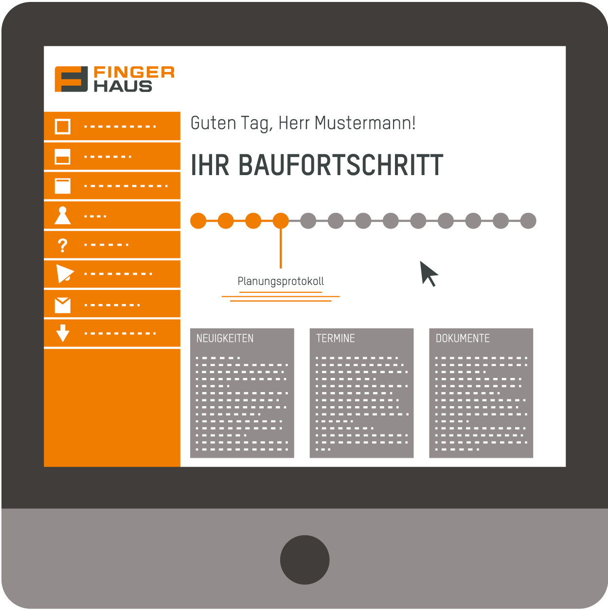 Über unsere Kundenplattform »mein.fingerhaus.de« können Sie den Fortschritt Ihres Bauvorhabens auch online verfolgen. Sie sehen unter anderem, wann was erledigt ist, welche Termine und Aufgaben anstehen und welche neuen Dokumente wir für Sie abgelegt haben. Sie sind jederzeit über den Stand Ihres Bauvorhabens genau informiert.