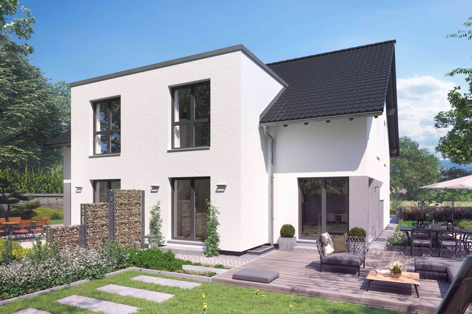 Wer mit Freunden oder Verwandten nah und doch getrennt wohnen möchte, entscheidet sich für das Doppelhaus DUO. Gerade bei hohen Grundstückspreisen und geringen Grundstücksgrößen in und um Ballungszentren ist die Möglichkeit, sich die Kosten für den Grundstückskauf zu teilen, ein wichtiges Kriterium, um den Traum vom eigenen Haus zu verwirklichen. FingerHaus bietet Ihnen verschiedene attraktive Grundrisse in unterschiedlichen Größen von 119 bis 151 m² (pro Doppelhaushälfte). Die Grundrisse variieren in Länge und Breite und können so an das vorhandene Grundstück angepasst werden. Erleben Sie Vielfalt im Doppelpack, denn DUO bietet individuelle Planungsvarianten zum Wohnen und Wohlfühlen mit architektonischer Vielfalt durch unterschiedliche Dachformen und attraktive Sonderbauteile.